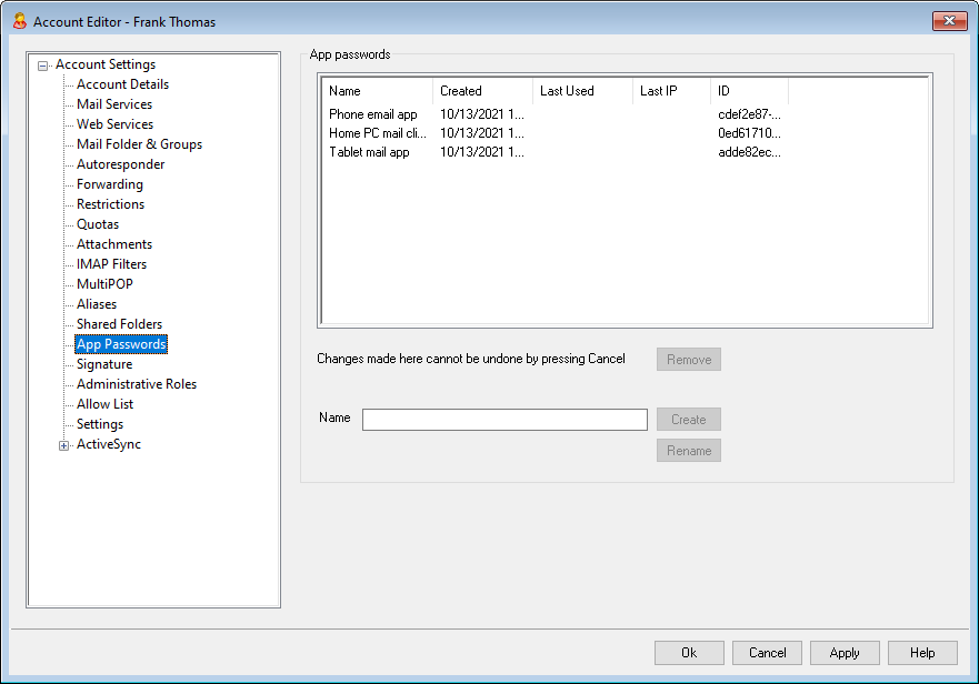 如果出于某些原因,您需要为您的一位用户创建或删除应用程序密码,您可以使用此页面上的选项来执行此操作。 就像在 Webmail 中一样,应用程序密码在创建时只会显示一次,因此应立即将其输入到应用程序中,或复制到某个地方以供以后使用。