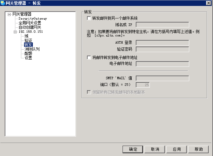有时在邮件送达时,为一个域转发所有邮件的副本是十分有利的。如果您希望配置MD来完成此过程则输入名称或域名的IP地址,让此域的接收邮件副本都发送到上述地址。如果您希望把邮件转发到一个特定的主机,用方括号表示(如[host.example.com])。 使用“验证登录/密码”选项可以包括要将邮件转发到的服务器的所有必要登录凭证。