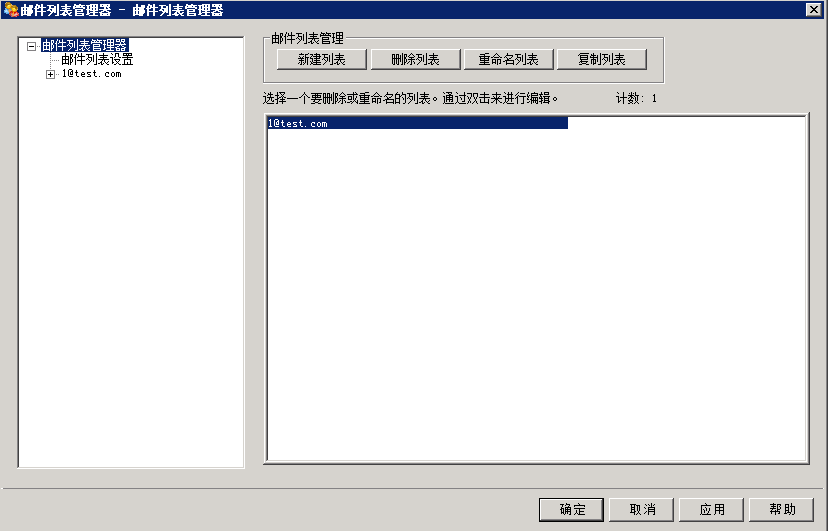 要新建邮件列表,请点击“新建列表”来打开“邮件列表邮件地址”对话框。创建邮箱名称并选择一个域,例如邮箱名为“MyList”,域为“example.com”。这将是邮件列表的邮件地址(例如 MyList@example.com)。会基于列表的特定设置,将发送至这个地址的邮件分发到列表的各个成员。点击“确定”来创建这个列表。创建完列表后,您可以双击其条目来配置相关设置并添加成员。请注意:列表的名称中不能包含“! ”或“|”。