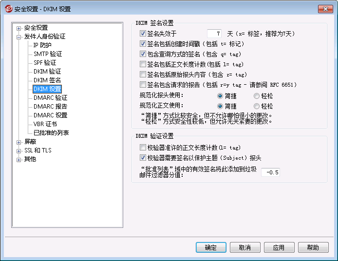如果要限制 DKIM 签名的有效天数,请激活该选项并指定所需天数。若邮件的签名已到期,那么该邮件将总无法通过验证。该选项对应的是签名的“x=”标签。默认启用该选项,并设为 7 天。