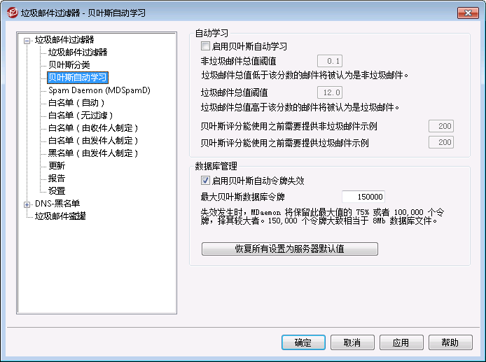 使用自动贝叶斯学习,可指定垃圾邮件和非垃圾邮件评分阈值,从而使贝叶斯学习系统能自动学习邮件,而无需手动将邮件放入垃圾邮件和非垃圾邮件文件夹。得分低于非垃圾邮件阈值的任何邮件将被自动学习系统视作非垃圾邮件,而得分高于阈值的邮件将被视作垃圾邮件。使用自动学习,可自动替换从数据库中删除的过期旧令牌(参见下面的数据库管理)。这样可以阻止手动训练覆盖过期标记的需求。如果您仔细设置阈值以避免在文件夹中不合适地分类邮件,自动学习十分有用。